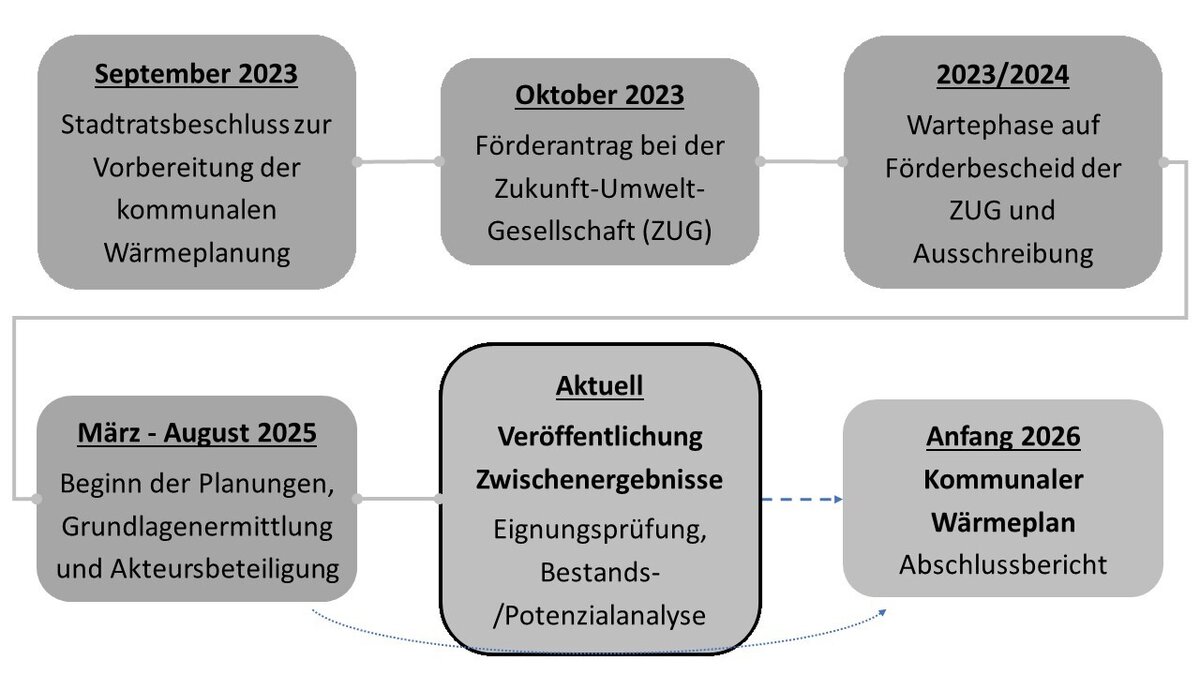 Die Stadt Schwandorf (30.000 Einwohner) wird somit bis spätestens 30. Juni 2028 eine kommunale Wärmeplanung durchführen müssen. Aufgrund der Inanspruchnahme einer Bundesförderung wird die Stadt die Wärmeplanung allerdings bereits bis Mitte 2026 abschließen müssen. Der aktuelle Bearbeitungsstand und der grobe Zeitplan sind in folgender Übersichtsgrafik dargestellt.