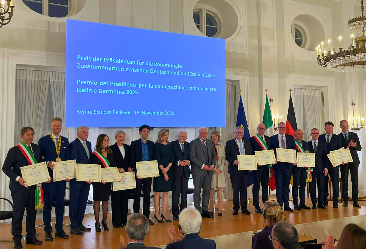 Ein besonderer Moment für die Stadt Schwandorf und ihre italienische Freundschaftsstadt Gualdo Tadino: Beide Kommunen wurden nun mit dem Deutsch-Italienischen Städtepartnerschaftspreis für ihr gemeinsames grenzüberschreitendes Engagement ausgezeichnet. Oberbürgermeister Andreas Feller und Bürgermeister Massimiliano Presciutti nahmen den Preis im Berliner Schloss Bellevue von Bundespräsident Frank-Walter Steinmeier und Italiens Staatspräsident Sergio Mattarella persönlich entgegen.