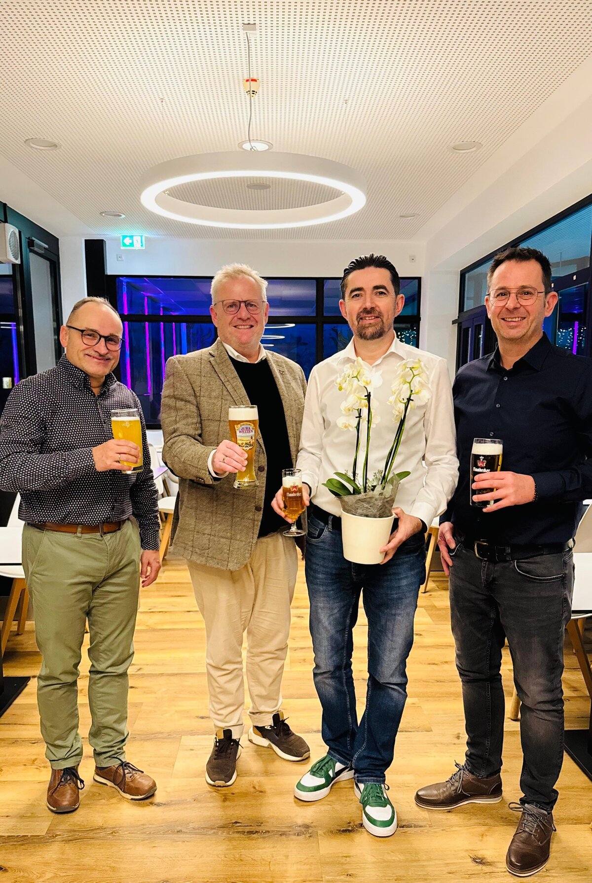 Oberbürgermeister Andreas Feller, der stellvertretende Kämmerer Peter Habermeier und Bäderleiter Michael Maget stießen gemeinsam mit Richard Krestel auf seinen Start im Hallenbad Dachelhofen an. „Ich freue mich, dass wir mit Herrn Krestel einen engagierten, versierten und sehr erfahrenen neuen Pächter gewonnen haben“, so der Oberbürgermeister. „Ich bin mir sicher, dass sein Konzept auch bei den Gästen großen Anklang finden wird, und wünsche ihm alles Gute.“