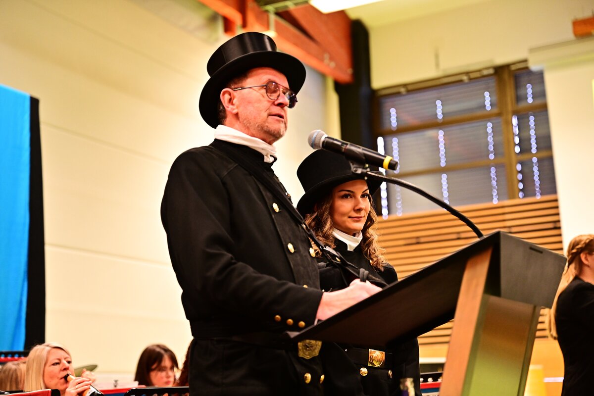 Mehr als 400 Gäste aus Stadt und Region folgten der Einladung. Bereits beim Eintreffen wurden sie am roten Teppich persönlich empfangen – neben Oberbürgermeister Andreas Feller und seiner Frau Susanne auch vom Zweiten Bürgermeister Andreas Wopperer sowie von der Dritten Bürgermeisterin Marion Juniec-Möller. Die Gästeliste spiegelte die gesamte Bandbreite des öffentlichen Lebens wider: Politik, Kirche, Wirtschaft, Bildung, Gesundheitswesen sowie zahlreiche Vereine und Verbände waren vertreten. Für einen besonderen Willkommensgruß sorgte Kaminkehrer-Ehrenobermeister Peter Wilhelm, der den Anwesenden einen kleinen Glücksbringer für das Jahr 2026 überreichte.