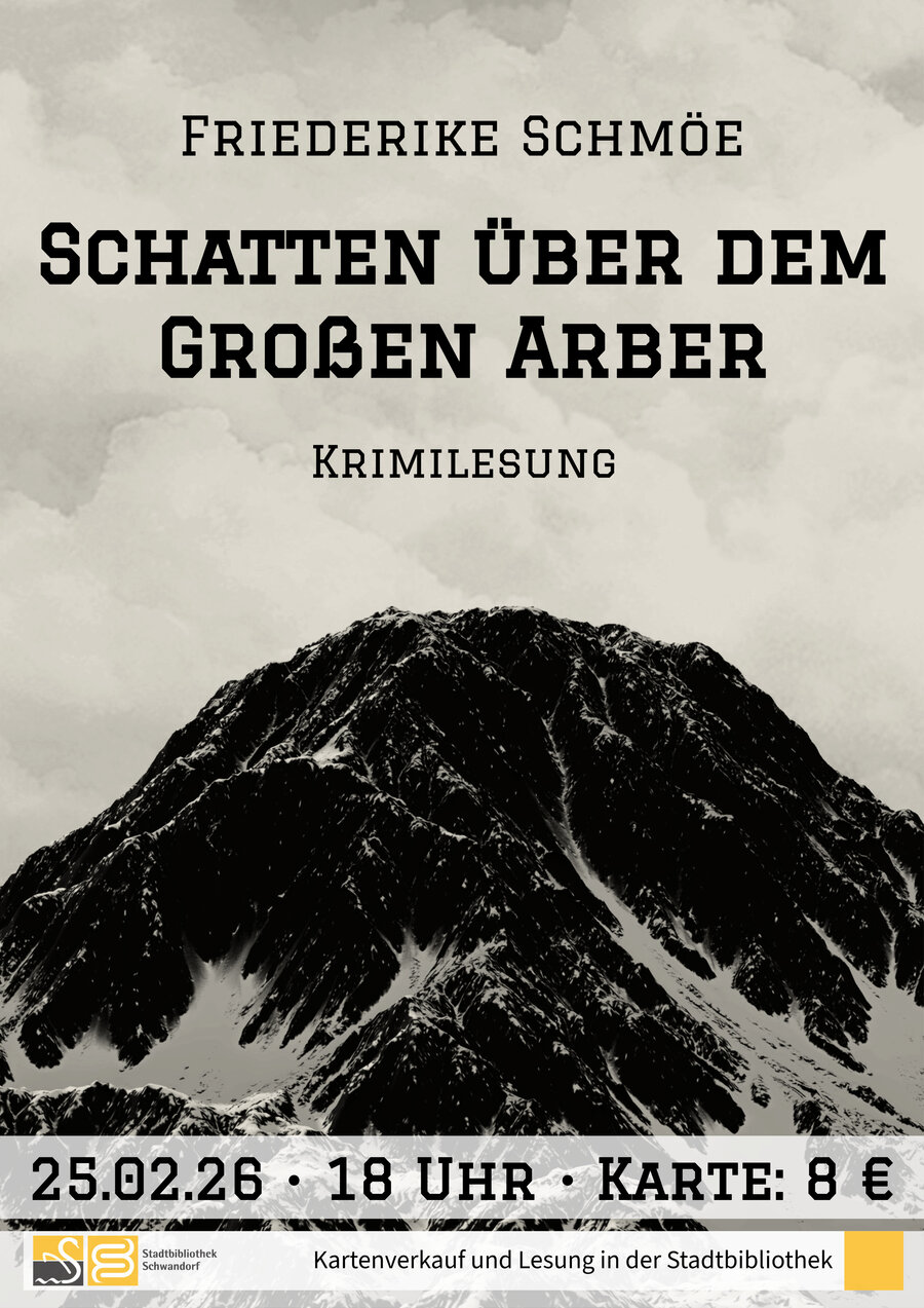 Am 25. Februar 2026 um 18:00 Uhr liest und stellt Friederike Schmöe ihren Kriminalroman Schatten über dem Großen Arber in der Bibliothek vor.
