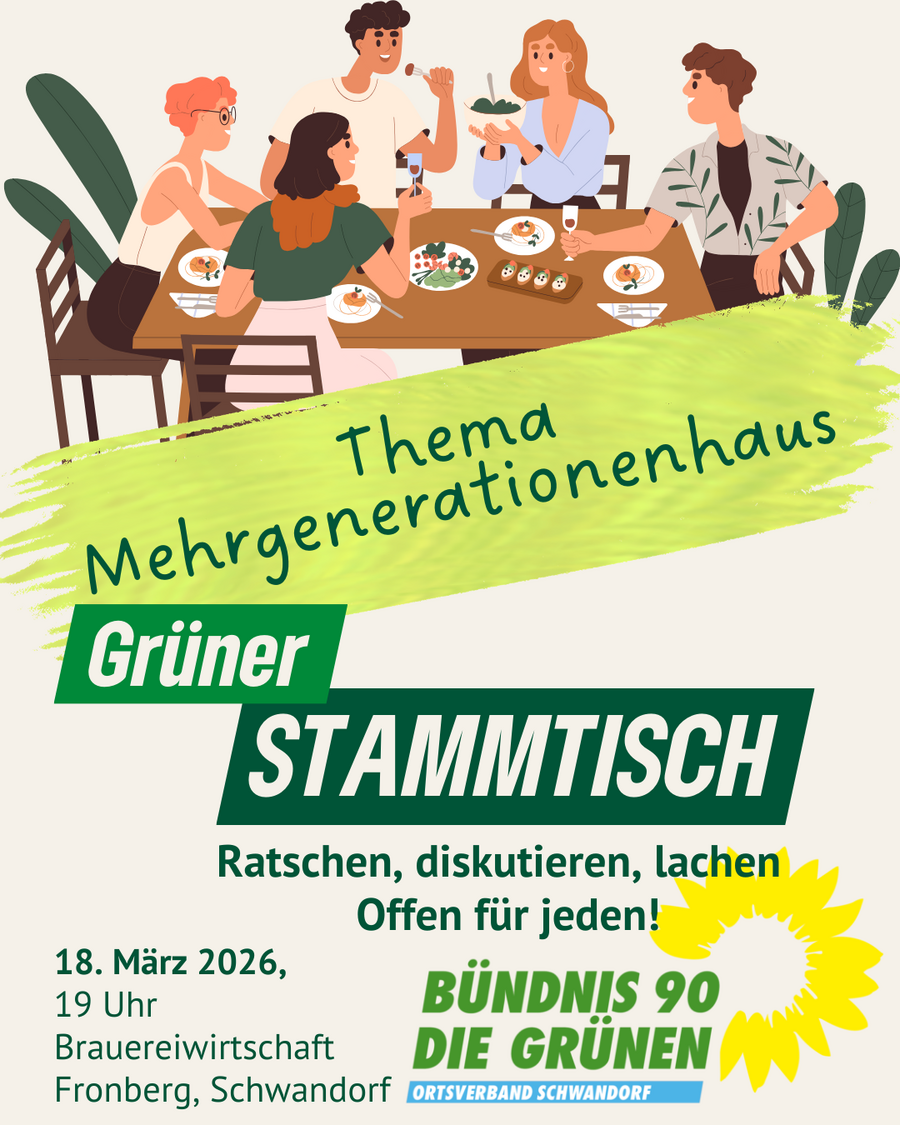 Am Mittwoch, 18.03.26, 19 Uhr, diskutieren wir mit Gästen vom Verein Pfad für Kinder. Thema des offenen Stammtischs ist die Gründung eines Familienzentrums oder eines Mehrgenerationenhauses in Schwandorf.